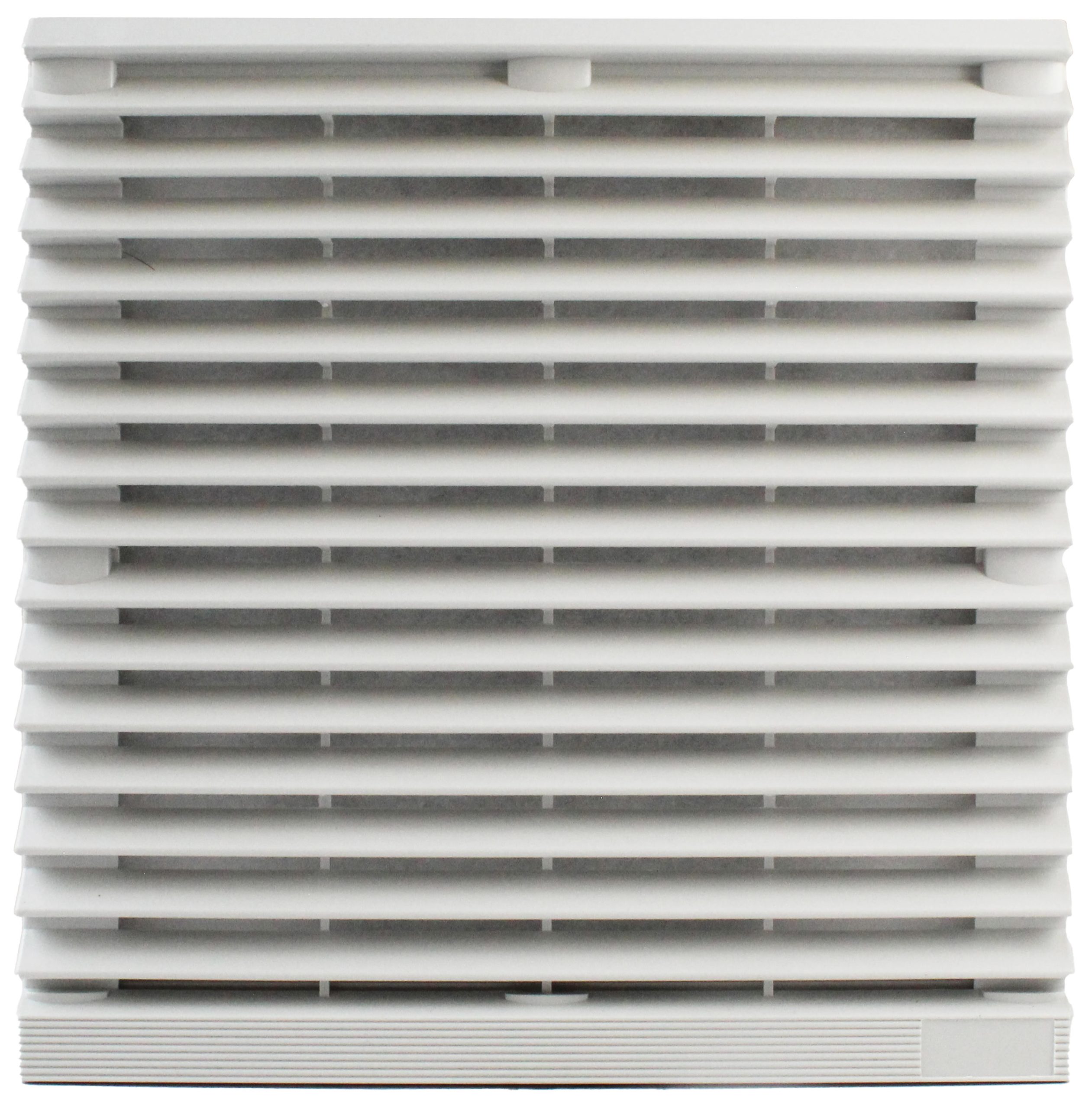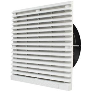 Louvered filter fan kits are designed to protect against dust, dirt, and moisture from entering industrial, electrical, and electronic cabinets. Available in a snap-on, slide, and hinged version, with the slide and hinged version featuring UV protection. The kits include the fan, louvered fan guard, filter, metal guard, and hardware. 30 PPI and 45 PPI filtration is standard, with enhanced filtration available.