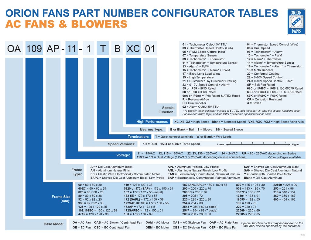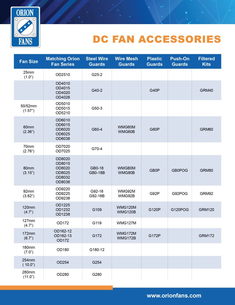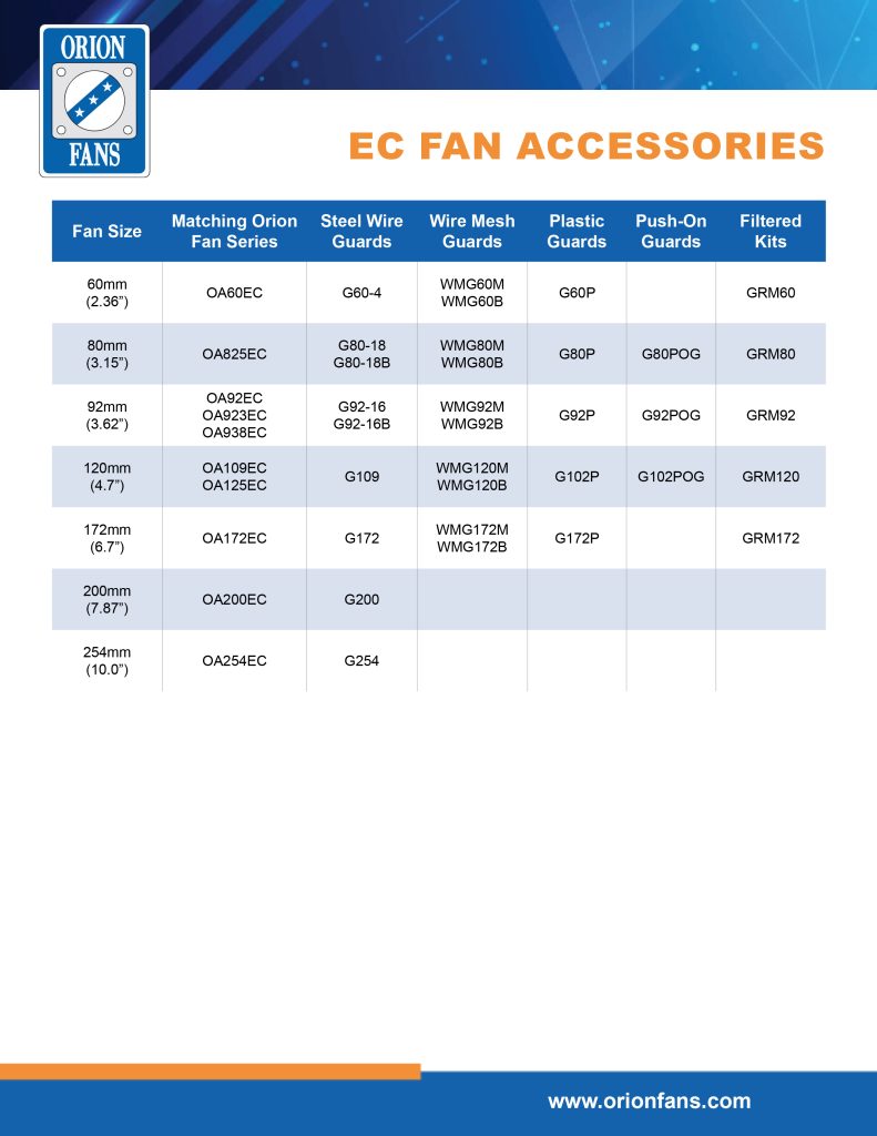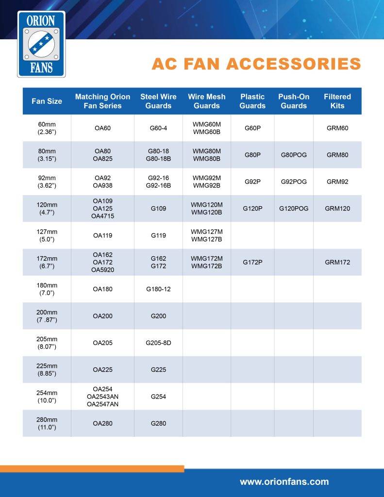 A quick reference guide to see all available products that Orion Fans offers.